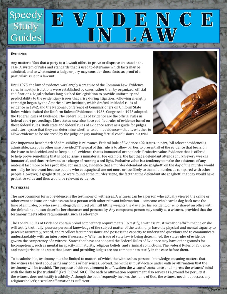 Details: Acquiring an understanding of evidence in law can be a confusing topic. Evidence can often be the determining factor between a case won, and one that suffers a loss. Without proper evidence a case cannot be won, and knowing the intricacies of evidence within cases and courts of law is often complicated, and difficult to grasp. Study guides relating to evidence help students of law comprehend these legal intricacies and the legal requirements behind them. It also helps students understand the various laws related to specific areas of legal practice. Study guides outline the specific evidence needed in particular areas, and specialties of law.