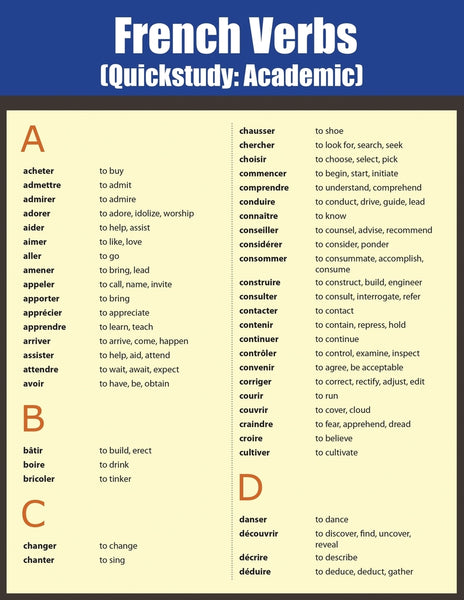 Details: This French Verbs pamphlet/quick reference guide gives you a summary of regular and irregular verbs that are often used in the French language and provides a quick reference for those studying French.