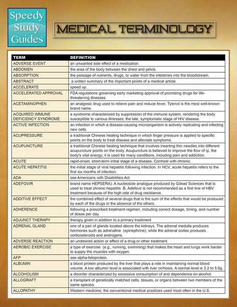 Details: If you're pursuing an exciting career in the medical field, you'll need to be fluent in medical terminology. It's the universal means of communicating for all medical professionals. It's a language unto itself. When you're sitting in the medical terminology class, the professor will skim over the terms for a given medical specialty. It's not likely your mind will grasp the terms immediately. Learning medical terminology involves memorization. Whereas learning other subjects can include association and hands-on techniques, learning medical terminology requires word repetition. You need to see, hear, and write the terms over and over. It's not very exciting for a field that's so fulfilling. This is where using a medical terminology guide can help. Diagrams of human anatomy give you a visual point of reference for the words. Information is presented in a user-friendly style. A variety of question formats makes self-review interesting. You have true-and-false, matching, and multiple choice. The questions help you use the words in context, which is what you'll be doing on your job. The geniuses behind a medical terminology guide know how to make learning fun. Online guides are especially engaging because they often include games. Some of them give you audio feedback, e.g., the program says "Great!" when you select the correct answer. Using a study guide can help you truly enjoy learning medical terminology. You'll come away from your study sessions feeling upbeat and confident. And once you've mastered medical terminology, you're on your way to a successful career!