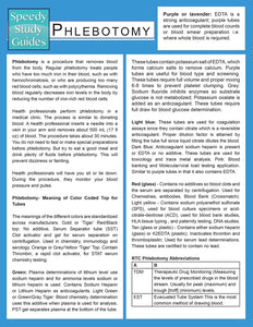 Details: Phlebotomy refers to the process of puncturing a vein and extracting blood. A phlebotomy reference guide that contained diagrams of the major veins would be very helpful to anyone who is planning to pursue a career in a health/medical field. Learning how much blood is needed for each test and what the different colored test tubes are used for would also be an easier task when you could refer to a guidebook. This type of resource could also be used for teaching or independent studies.