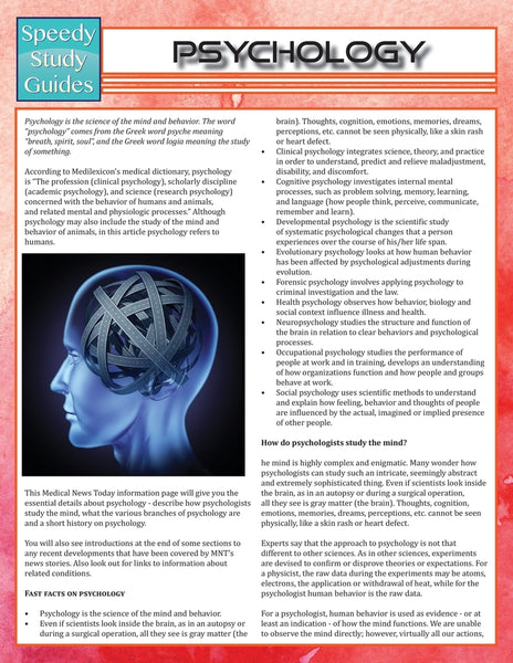 Details: Psychology is a fascinating subject because it deals with the science of the mind and a person's behavior. A psychology study guide can be a great tool for finding out information you need to understand about the topic and to help you when studying for test or as a reference for studying. One of the benefits of a psychology study guide is that it forces you to reflect on and understand, basic and more comprehensive concepts. Another benefit of a psychology study guide is that help you to understand the terms of psychology without going "nuts" trying to comprehend terms that are sometimes difficult to understand. Most importantly, a psychology study guide is helpful because it can be used as a permanent reference; it will help reinforce what you have learned. You can go back anytime you want to go over terms and definitions that you don't understand and that can give you an edge when taking Psychology.